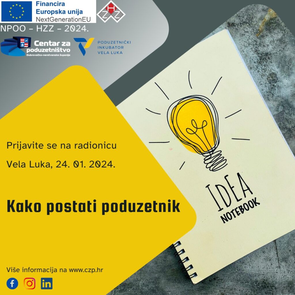 Kako bismo vam olakšali i uputili vas na pravi smjer, Poduzetnički inkubator Vela Luka u suradnji s Hrvatskim zavodom za zapošljavanje (HZZ) i Centrom za poduzetništvo DNŽ, poziva sve zainteresirane na besplatnu radionicu “Kako postati poduzetnik” koja će se održati u 24.01.2024., s početkom u 10.00 sati u Veloj Luci.